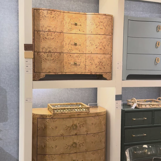 The Worlds Away Plymouth Chest in burl wood features a 3 drawer cabinet with irregular patterns and small spots that give it an elegant and organic feel. Enhanced with beautiful acrylic and brass hardware, the Plymouth by Worlds Away creates an elegant ambiance in homes and offices alike.