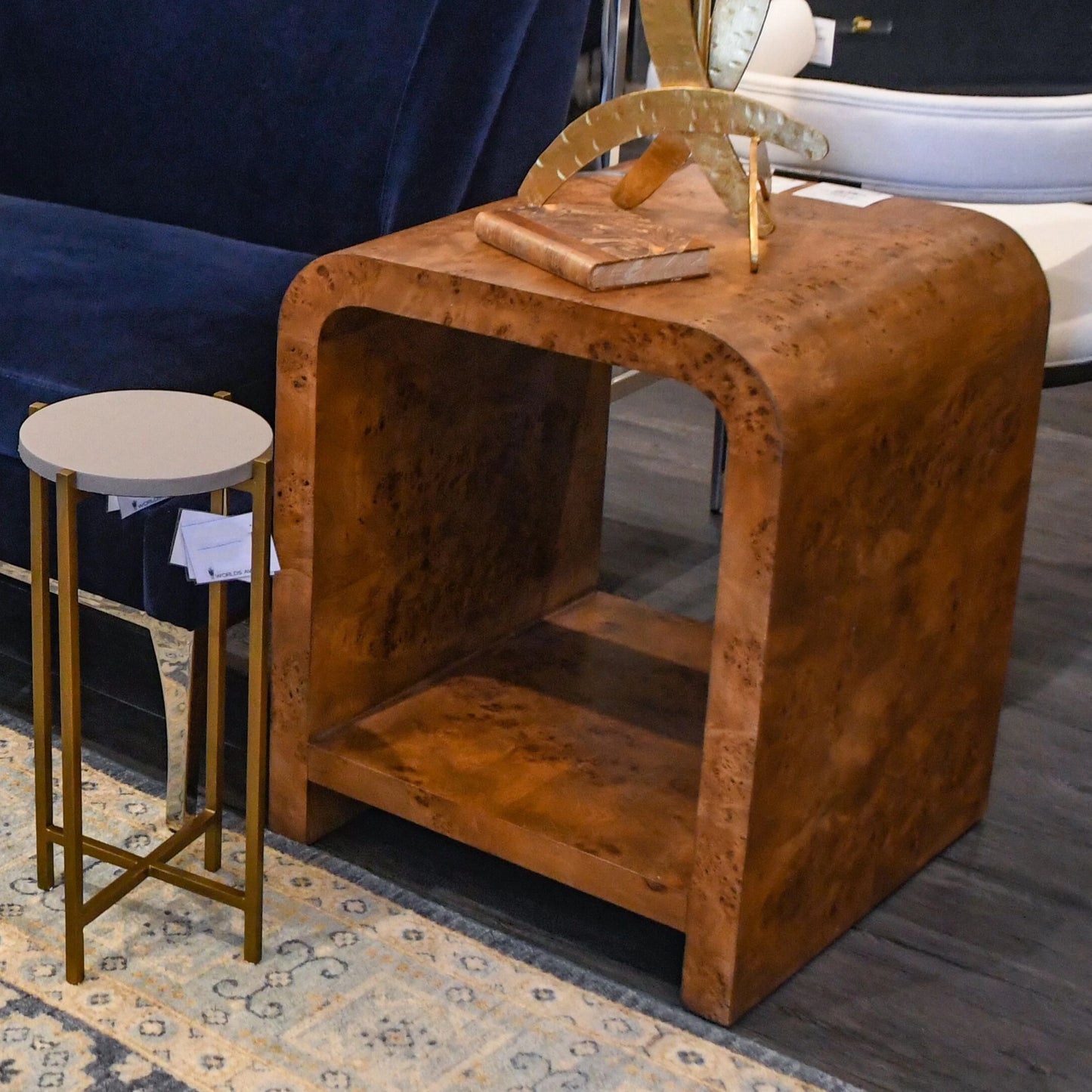 The Worlds Away Putnam Dark Burl Wood Side Table features an elegant waterfall edged design.  The two tiers on the Putnam provide extra storage while the top provides space for lighting.