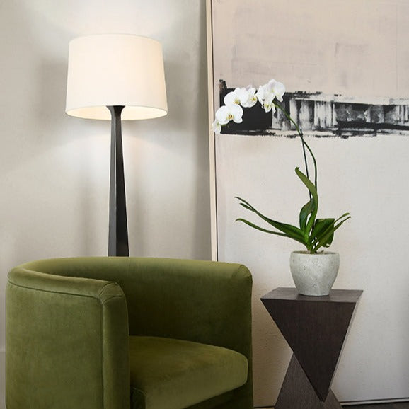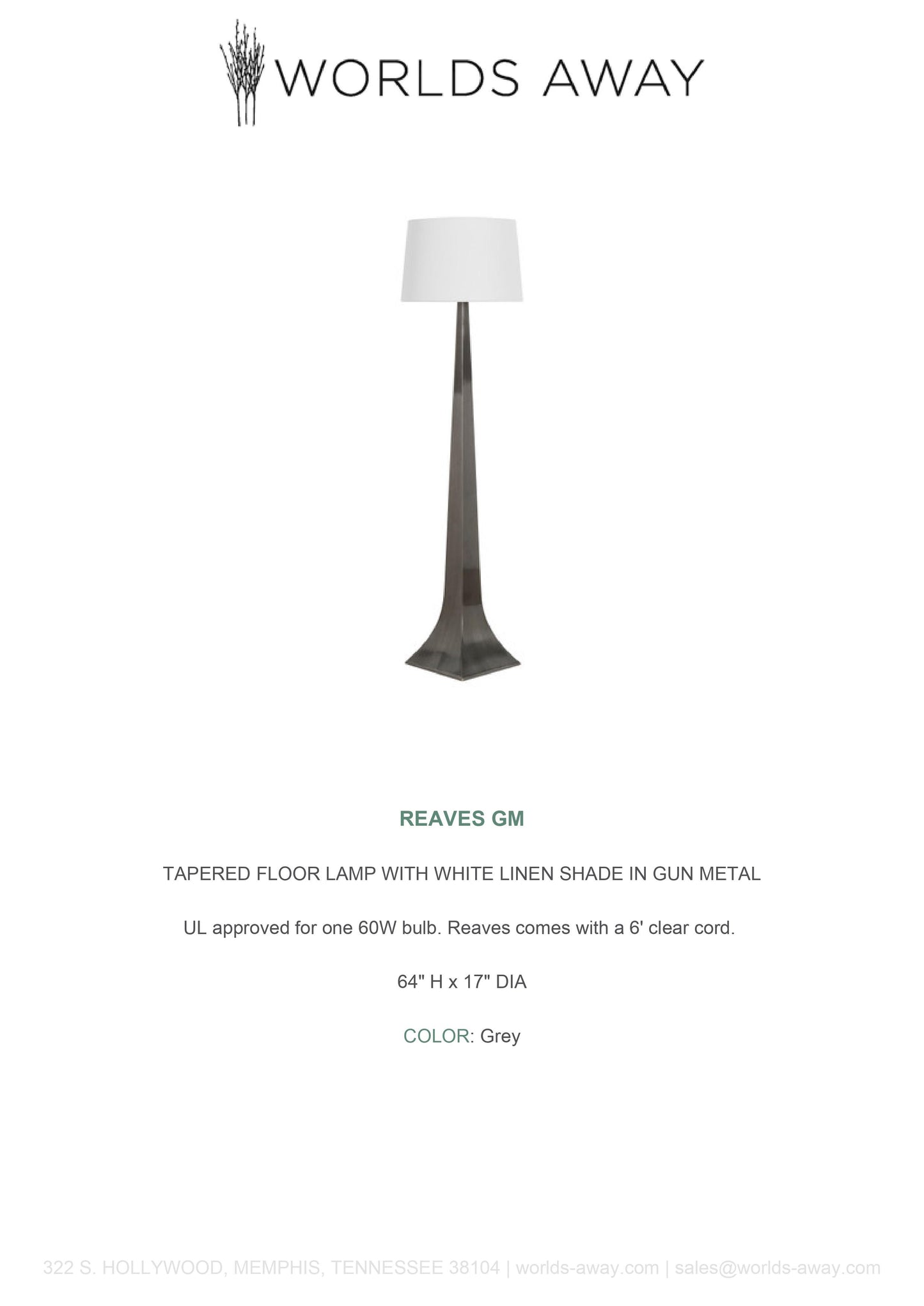 Illuminate your space with the Reaves Floor Lamp in Gunmetal from Worlds Away. The Reaves features a tapered floor lamp crafted in gunmetal, and topped with a white linen shade.