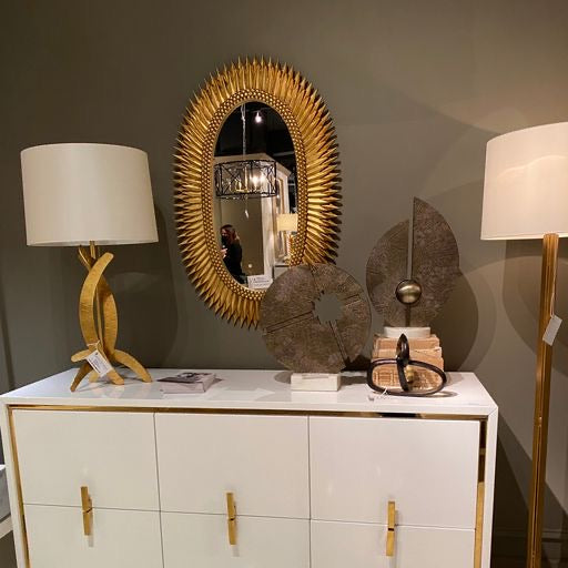 The Rita Mirror in Gold Leaf from Worlds Away showcases a captivating starburst oval design that adds a touch of sophistication to both modern and classic interior designs. This decorative mirror is guaranteed to elevate the aesthetic appeal of any room.