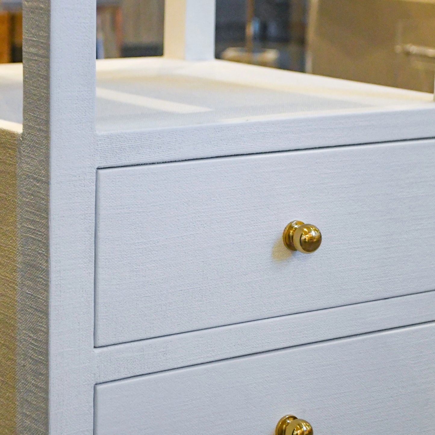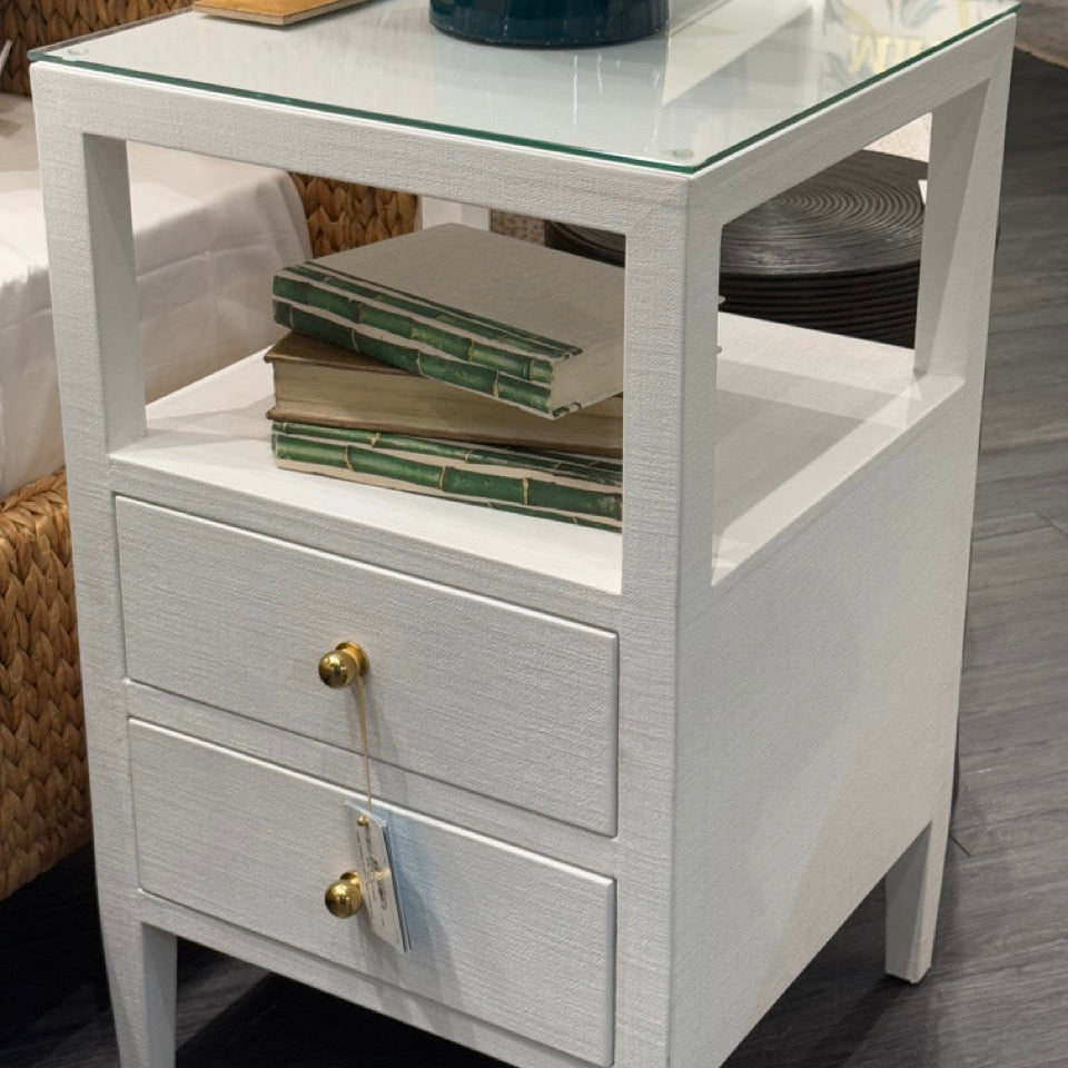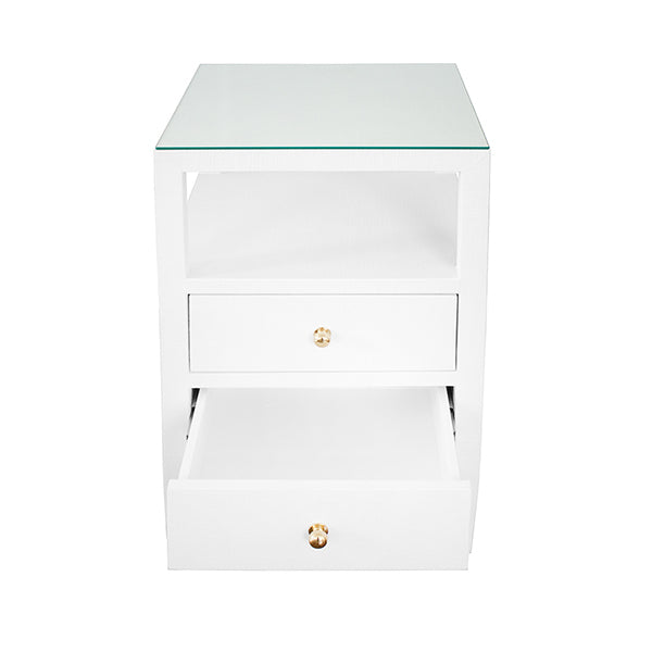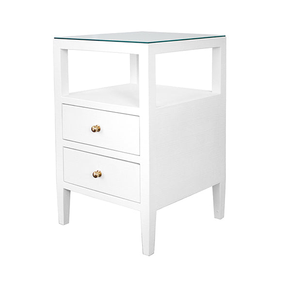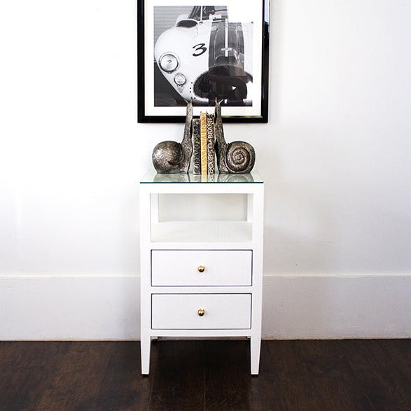 The Roscoe Side Table from Worlds Away features a square shape that is perfect by the bed or sofa. Covered in a beautiful white linen, the texture of the Roscoe brings depth to all furniture around it. Two drawers on the Roscoe nightstand allow for small items to be tucked away for safekeeping.
