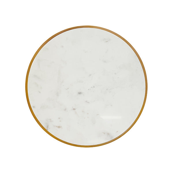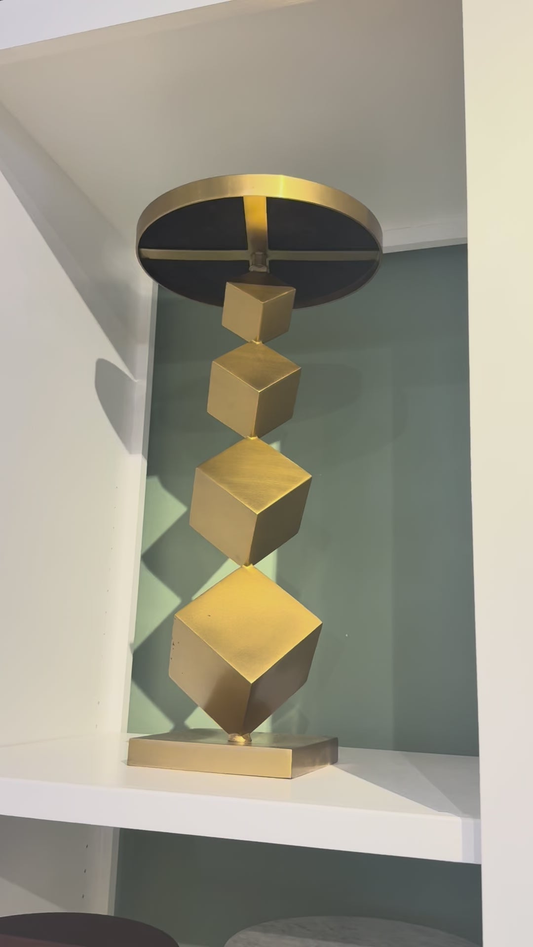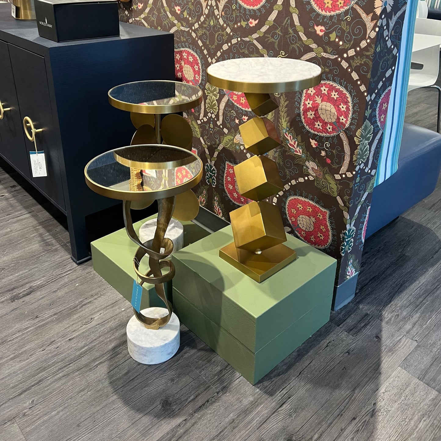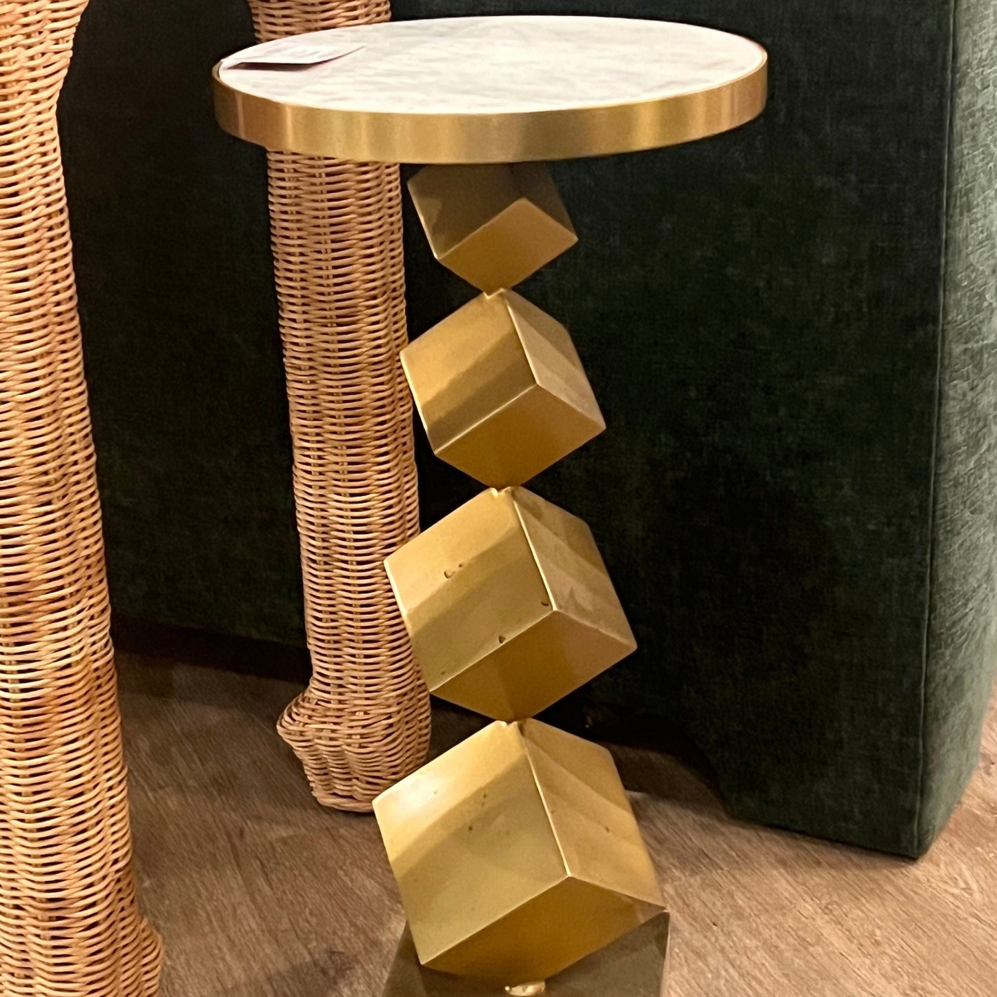 The Salvador Side Table in Antique Brass from Worlds Away showcases a stacked cubic design, crafted from antique brass and accented with an inset white marble top.