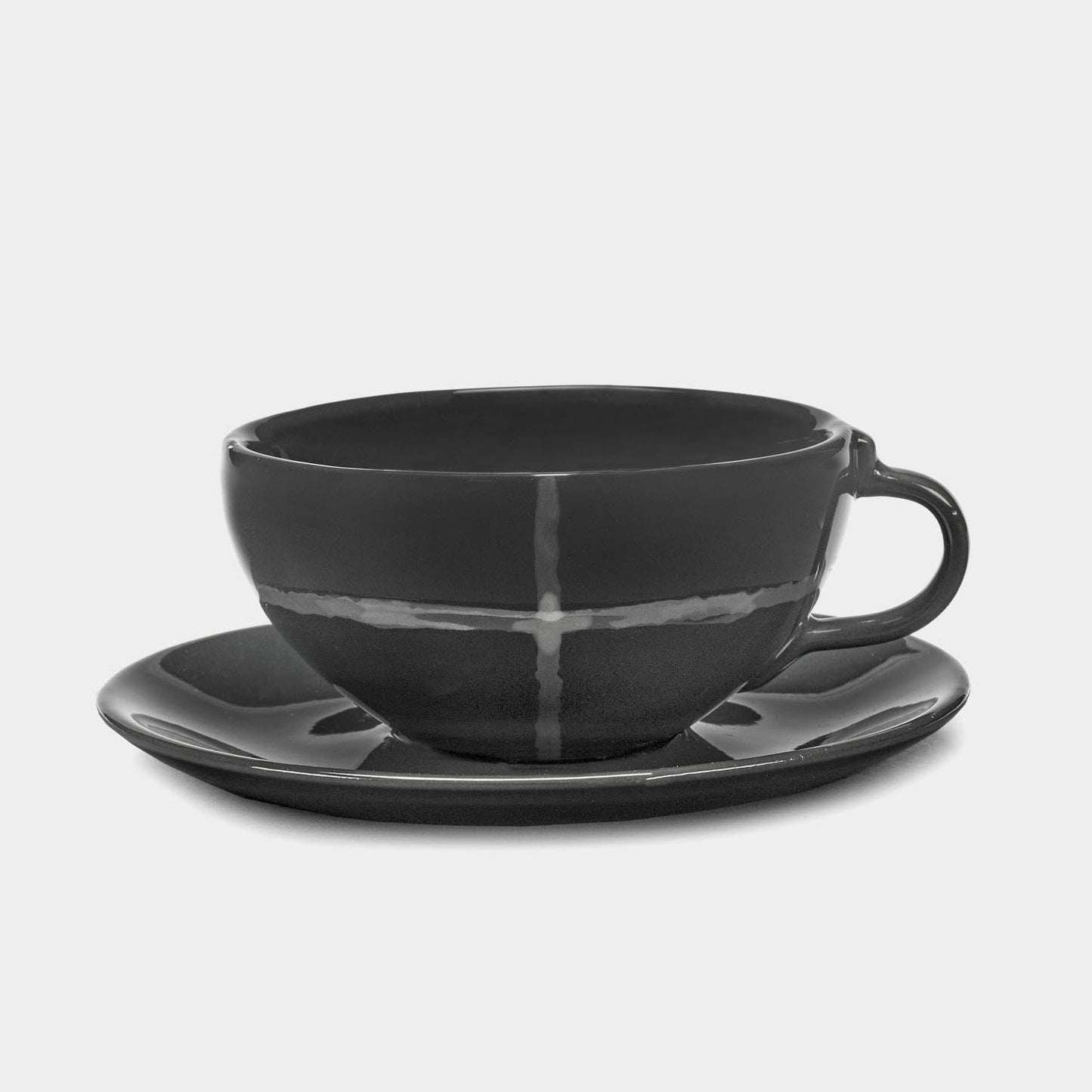 Kelly Wearstler started from a digital graphic pattern, inspired by Bauhaus principles, to design the Zuma Coffee Cup and Saucer Set of 4 in Pacific from Serax which features a range of porcelain tableware. Each pattern is hand-stamped onto the pieces for a hand-painted look and feel, after which the glaze is applied.
