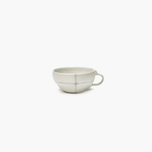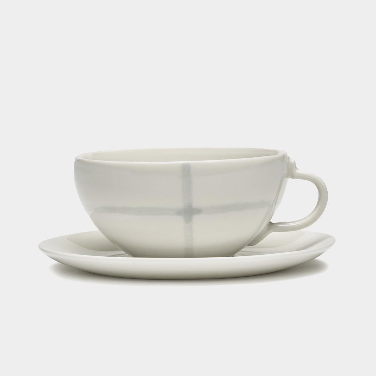 Kelly Wearstler started from a digital graphic pattern, inspired by Bauhaus principles, to design the Zuma Coffee Cup and Saucer Set of 4 in Salt from Serax which features a range of porcelain tableware. Each pattern is hand-stamped onto the pieces for a hand-painted look and feel, after which the glaze is applied.