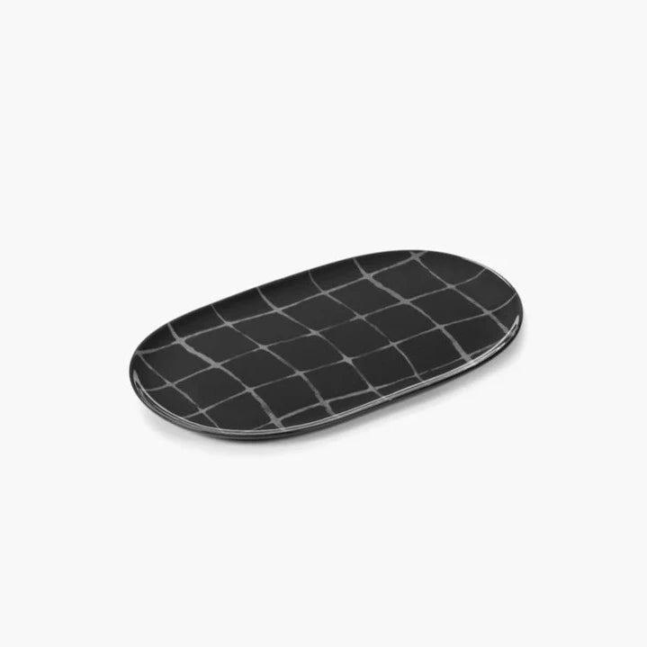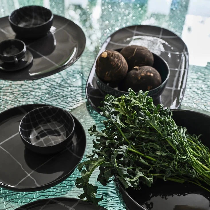 Kelly Wearstler started from a digital graphic pattern, inspired by Bauhaus principles, to design the Zuma Serving Dish in Pacific from Serax which features a range of porcelain tableware. Each pattern is hand-stamped onto the pieces for a hand-painted look and feel, after which the glaze is applied.